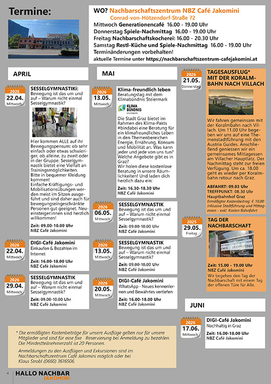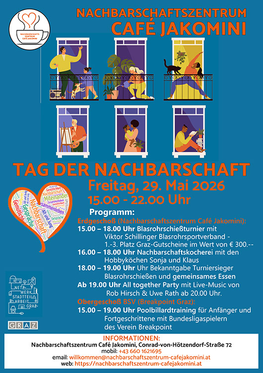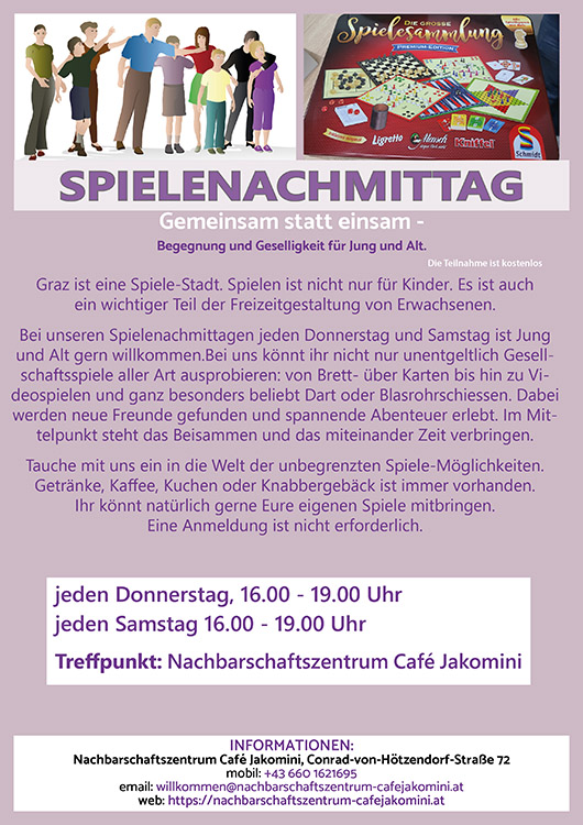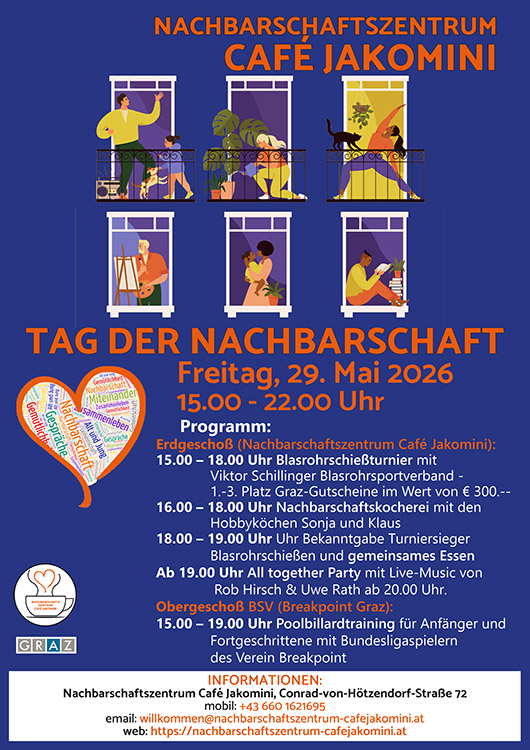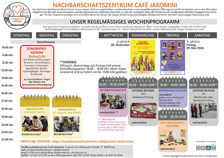 Das Nachbarschaftszentrum ist ein offener Ort für Begegnung, gemeinschaftliche Aktivitäten, eine Anlauf- und Beratungsstelle für spezifische Problemlagen und eine Drehscheibe für die Förderung von Projekten zur nachbarschaftlichen Begegnung und zur Gestaltung der Lebensräume des 6. Grazer Gemeindebezirks Jakomini.